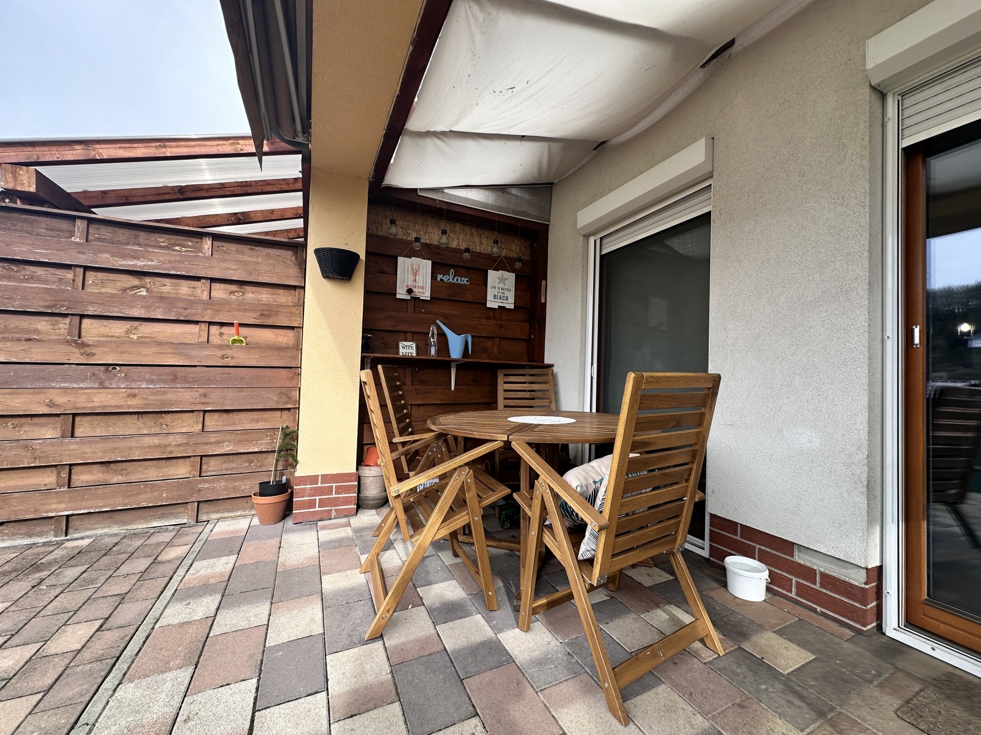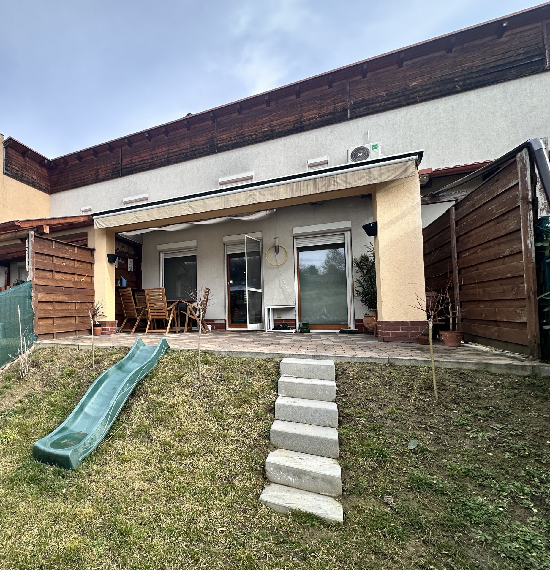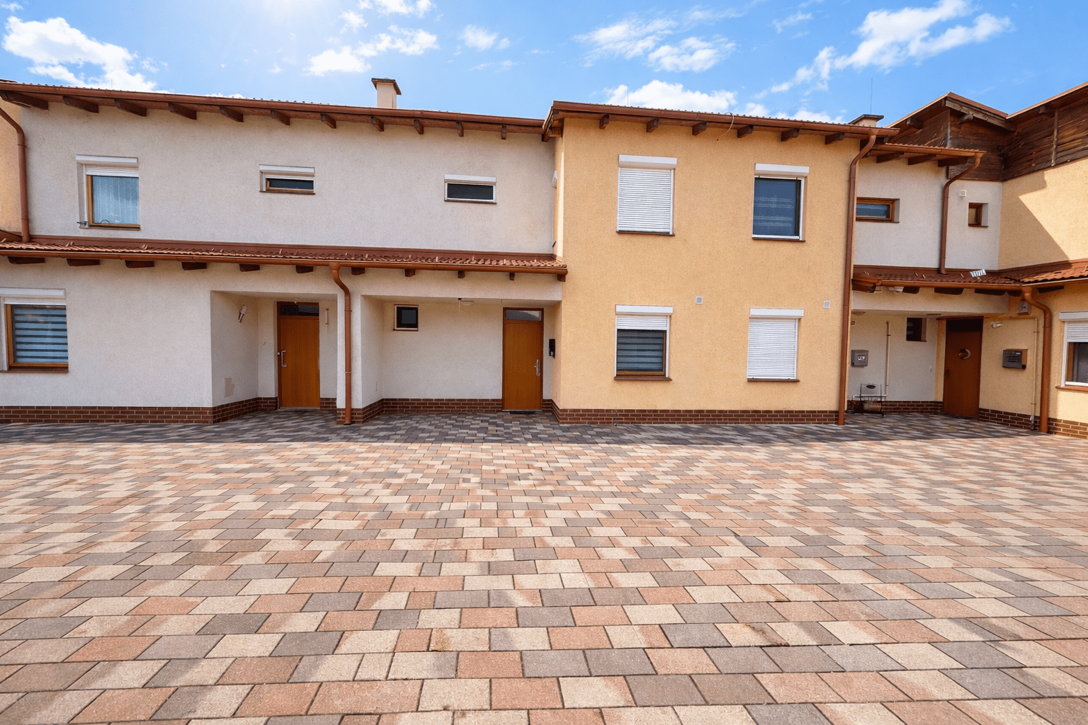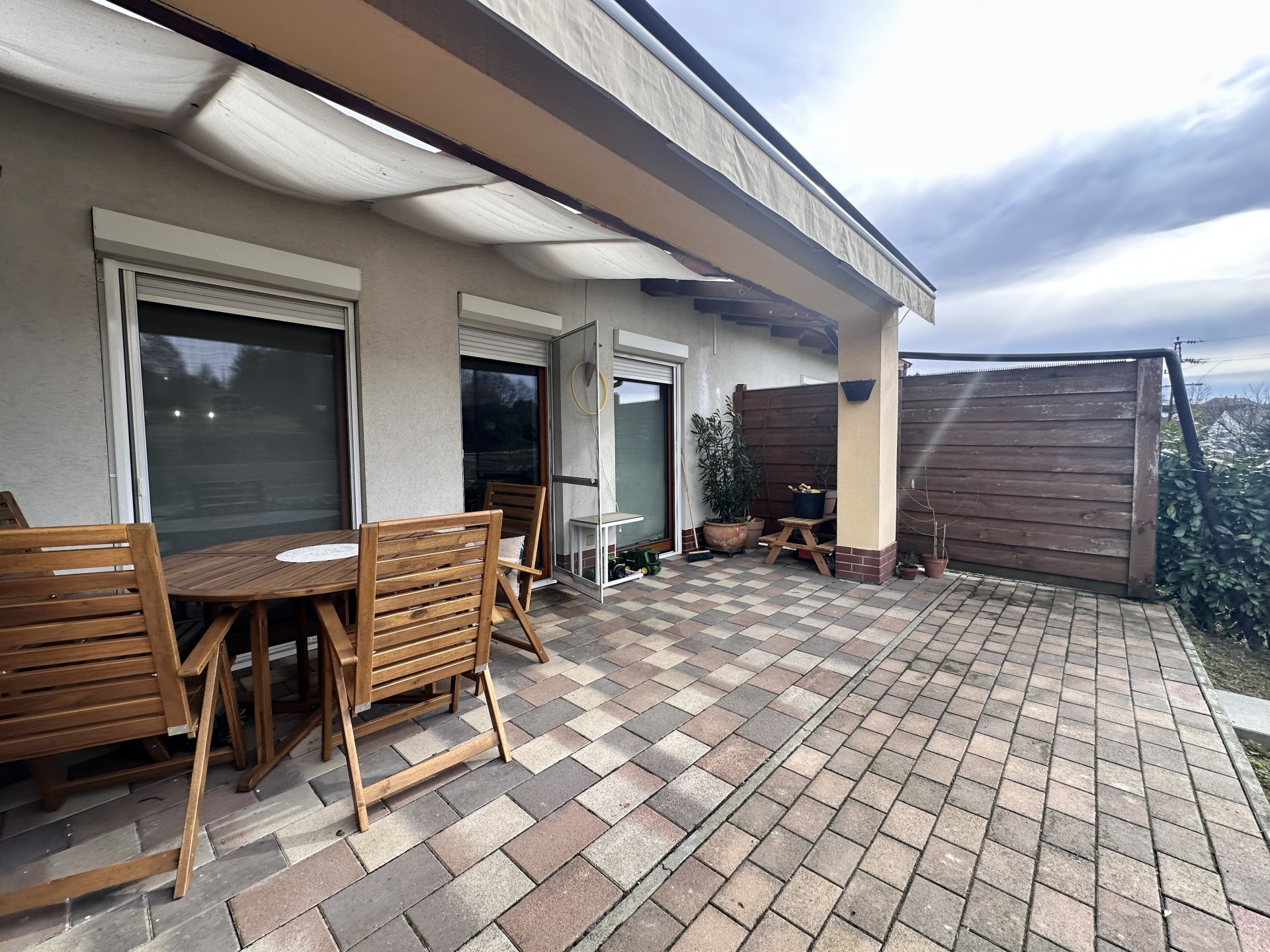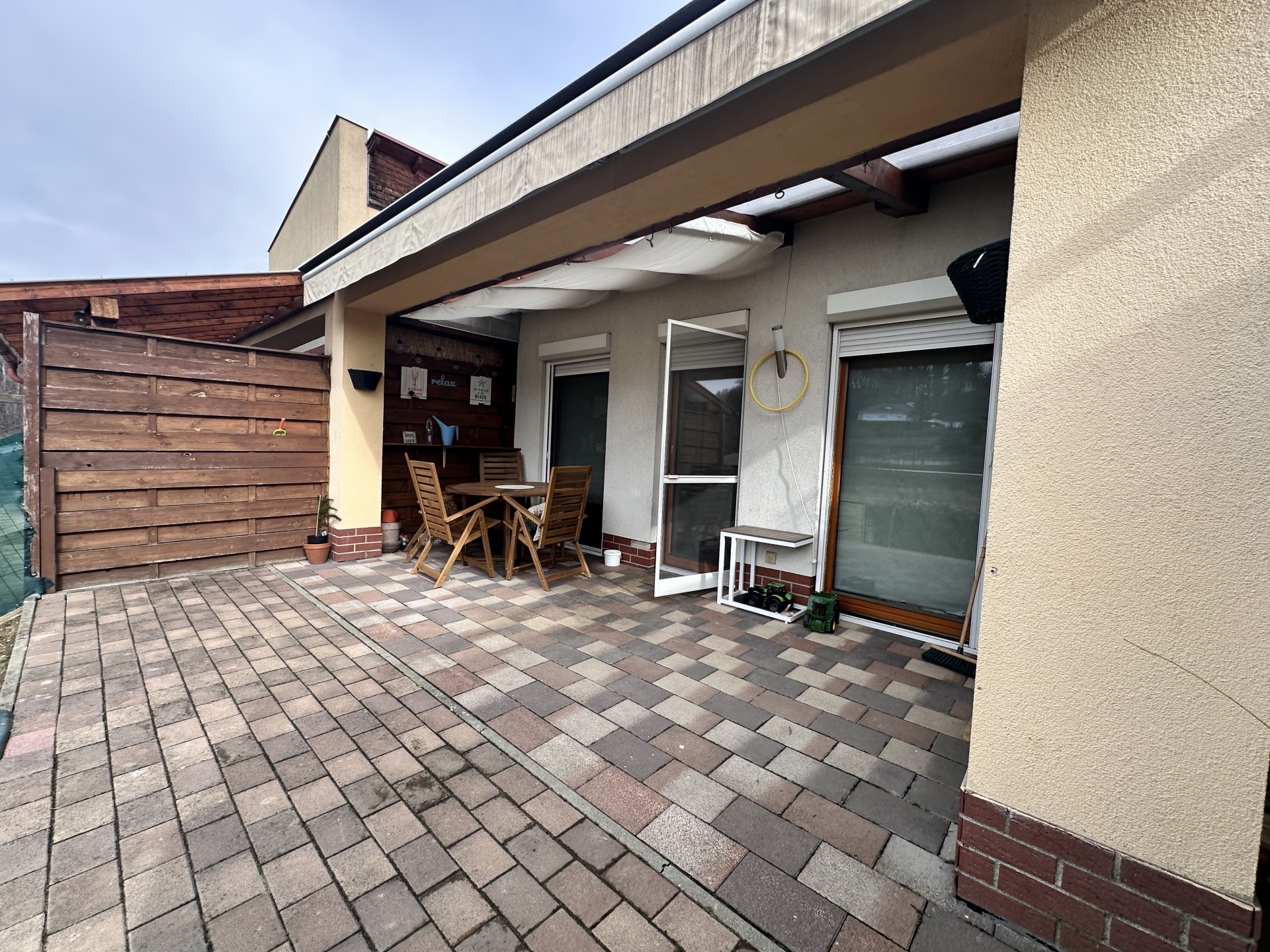 A 81 m²-es, tégla építésű, 14 éve épült lakás egy térköves udvarból nyílik, külön bejárattal, sorházi jellegű elrendezéssel. A ház előtt két saját autóbeálló tartozik hozzá, az udvarban pedig egy külön, kaviccsal leszórt vendégparkoló is rendelkezésre áll, valamint egy körülbelül 4 m²-es, praktikus szerszámtároló is a lakás részét képezi. A tető cserépfedésű.