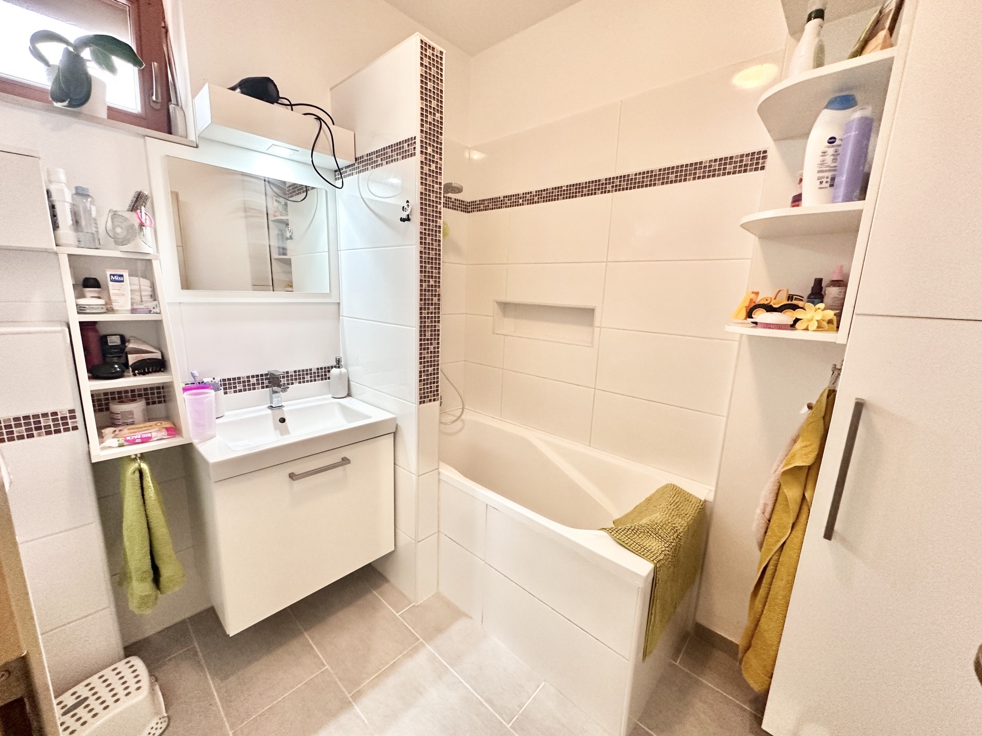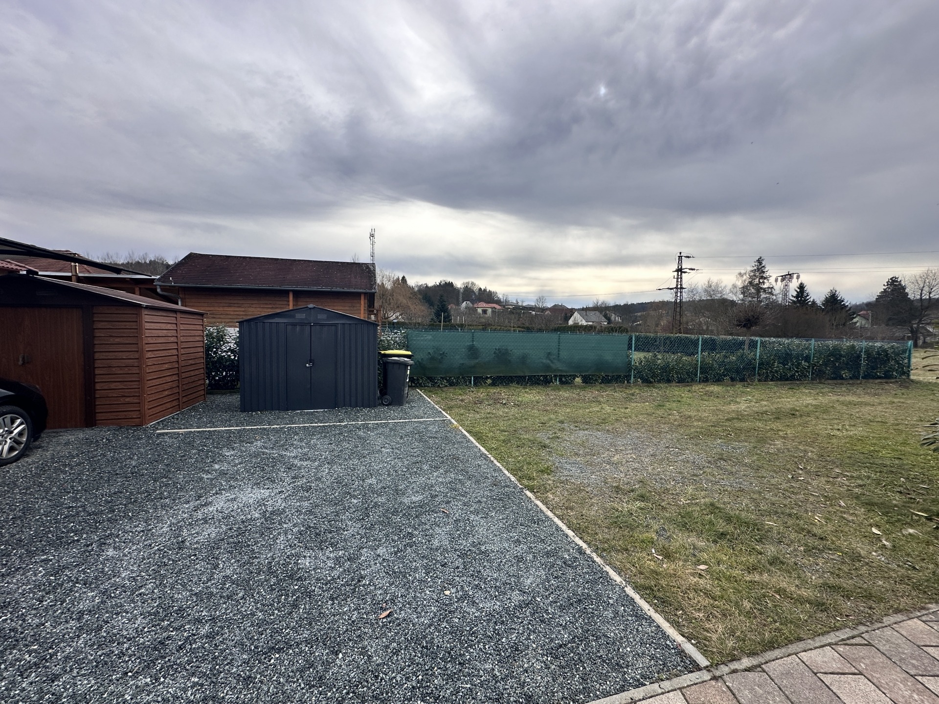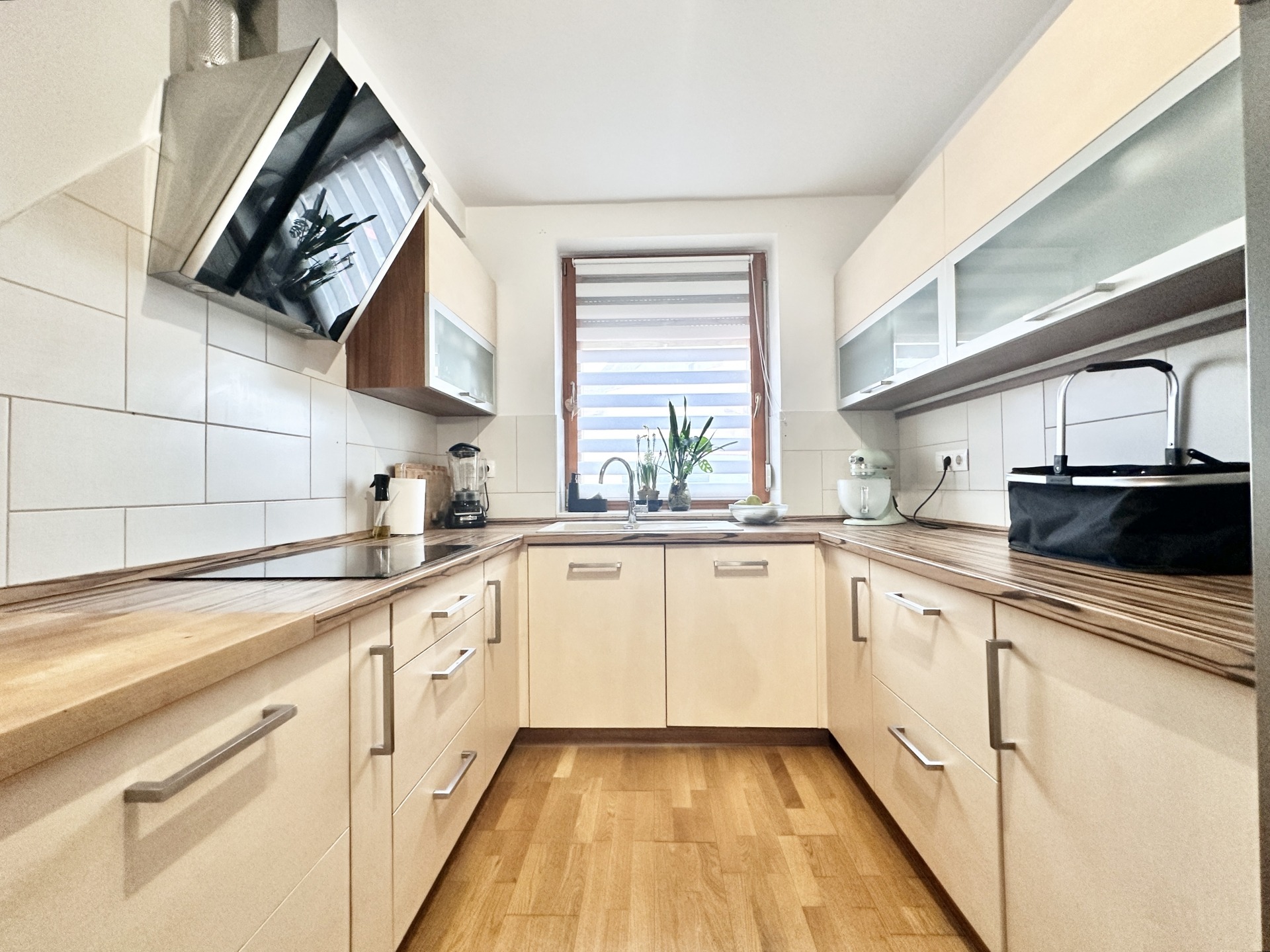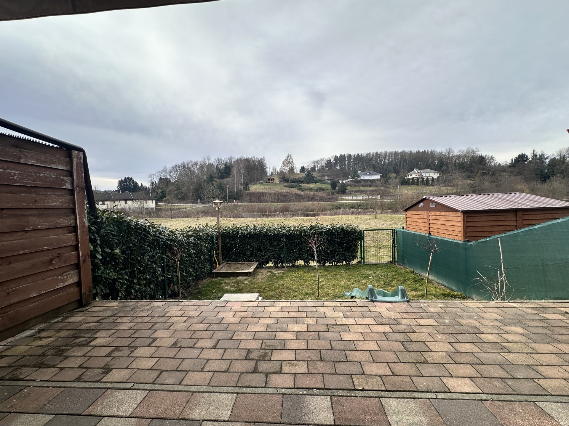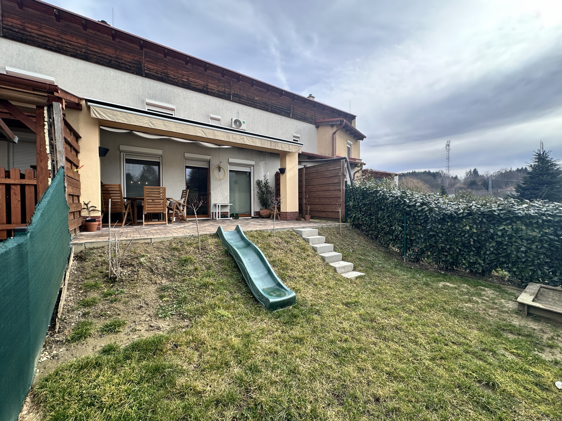 Az alsó szinten tágas nappali található amerikai konyhával, egy külön nyíló szobával, zuhanyzós fürdőszobával, valamint egy előszobával/szélfogóval. A nappaliból közvetlen kijárat nyílik a 18 m²-es térköves teraszra, amelyhez egy körülbelül 20 m²-es, körbekerített, füves kertrész is kapcsolódik – ideális helyszín pihenéshez, gyermekeknek vagy akár egy baráti összejövetelhez. A beépített, gépesített konyhabútor a vételár részét képezi.